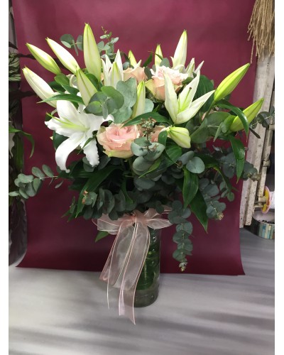 Cam Vazoda Beyaz Lilyum ve Pembe Gül