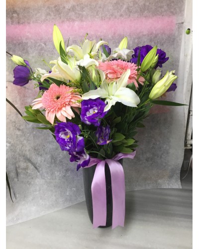 Vazoda Pembe Gerbera, Beyaz Lilyum ve Mor Lisyantus